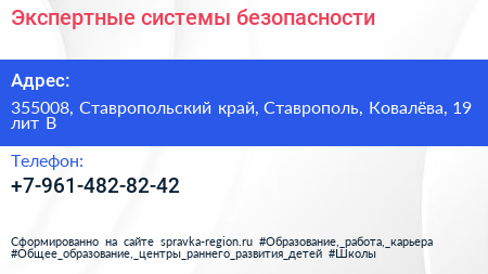 Экспертные системы безопасности по адресу 355008, Ставропольский край, Ставрополь, Ковалёва, 19 лит В в дальнейшем Организация, размещена в следующих категориях: