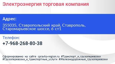Электроэнергия, торговая компания по адресу 355035, Ставропольский край, Ставрополь, Старомарьевское шоссе, 6 ст1 в дальнейшем Организация, размещена в следующих категориях: