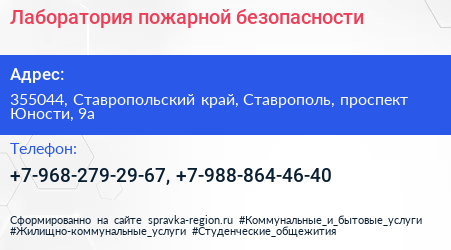 Лаборатория пожарной безопасности по адресу 355044, Ставропольский край, Ставрополь, проспект Юности, 9а в дальнейшем Организация, размещена в следующих категориях: