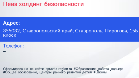 Нева, холдинг безопасности по адресу 355032, Ставропольский край, Ставрополь, Пирогова, 15Б киоск в дальнейшем Организация, размещена в следующих категориях:
