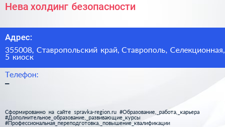 Нева, холдинг безопасности по адресу 355008, Ставропольский край, Ставрополь, Селекционная, 5 киоск в дальнейшем Организация, размещена в следующих категориях: