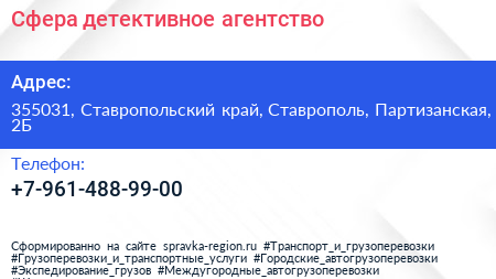 Сфера, детективное агентство по адресу 355031, Ставропольский край, Ставрополь, Партизанская, 2Б в дальнейшем Организация, размещена в следующих категориях: