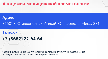 Академия медицинской косметологии по адресу 355017, Ставропольский край, Ставрополь, Мира, 331 в дальнейшем Организация, размещена в следующих категориях: