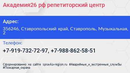 Академия26.рф, репетиторский центр по адресу 356246, Ставропольский край, Ставрополь, Музыкальная, 2 в дальнейшем Организация, размещена в следующих категориях: