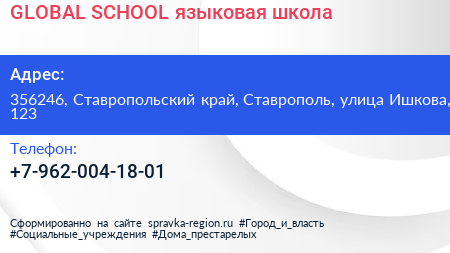 GLOBAL SCHOOL, языковая школа по адресу 356246, Ставропольский край, Ставрополь, улица Ишкова, 123 в дальнейшем Организация, размещена в следующих категориях: