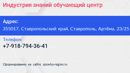 Индустрия знаний, обучающий центр по адресу 355017, Ставропольский край, Ставрополь, Артёма, 23/25 в дальнейшем Организация, размещена в следующих категориях: