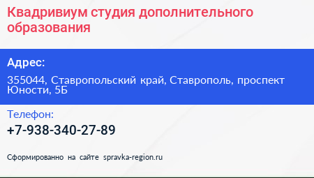 Квадривиум, студия дополнительного образования по адресу 355044, Ставропольский край, Ставрополь, проспект Юности, 5Б в дальнейшем Организация, размещена в следующих категориях: