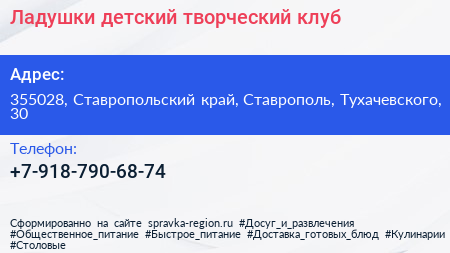 Ладушки, детский творческий клуб по адресу 355028, Ставропольский край, Ставрополь, Тухачевского, 30 в дальнейшем Организация, размещена в следующих категориях: