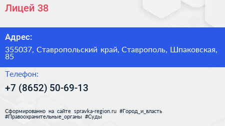 Лицей №38 по адресу 355037, Ставропольский край, Ставрополь, Шпаковская, 85 в дальнейшем Организация, размещена в следующих категориях: