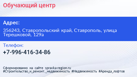 Обучающий центр по адресу 356243, Ставропольский край, Ставрополь, улица Терешковой, 129а в дальнейшем Организация, размещена в следующих категориях: