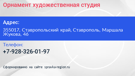 Орнамент, художественная студия по адресу 355017, Ставропольский край, Ставрополь, Маршала Жукова, 46 в дальнейшем Организация, размещена в следующих категориях: