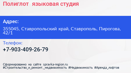 Полиглот+, языковая студия по адресу 355045, Ставропольский край, Ставрополь, Пирогова, 42/1 в дальнейшем Организация, размещена в следующих категориях: