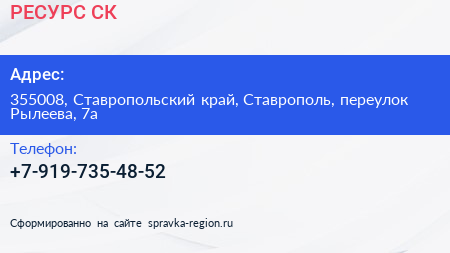 РЕСУРС СК по адресу 355008, Ставропольский край, Ставрополь, переулок Рылеева, 7а в дальнейшем Организация, размещена в следующих категориях: