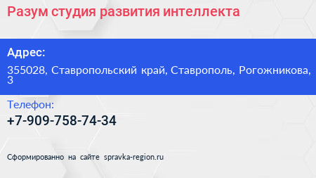 Разум, студия развития интеллекта по адресу 355028, Ставропольский край, Ставрополь, Рогожникова, 3 в дальнейшем Организация, размещена в следующих категориях: