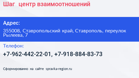 Шаг+, центр взаимоотношений по адресу 355008, Ставропольский край, Ставрополь, переулок Рылеева, 7 в дальнейшем Организация, размещена в следующих категориях: