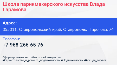 Школа парикмахерского искусства Влада Гарамова по адресу 355011, Ставропольский край, Ставрополь, Пирогова, 74 в дальнейшем Организация, размещена в следующих категориях: