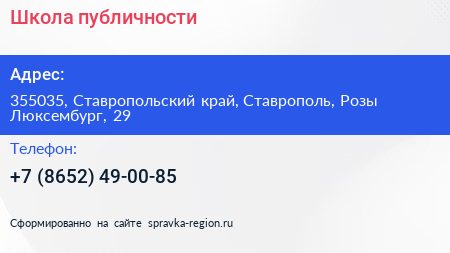 Школа публичности по адресу 355035, Ставропольский край, Ставрополь, Розы Люксембург, 29 в дальнейшем Организация, размещена в следующих категориях: