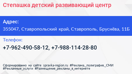 Степашка, детский развивающий центр по адресу 355047, Ставропольский край, Ставрополь, Бруснёва, 11Б в дальнейшем Организация, размещена в следующих категориях: