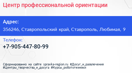 Центр профессиональной ориентации по адресу 356246, Ставропольский край, Ставрополь, Любимая, 9 в дальнейшем Организация, размещена в следующих категориях: