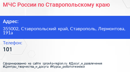 МЧС России по Ставропольскому краю по адресу 355002, Ставропольский край, Ставрополь, Лермонтова, 191а в дальнейшем Организация, размещена в следующих категориях: