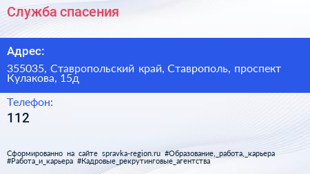 Служба спасения по адресу 355035, Ставропольский край, Ставрополь, проспект Кулакова, 15д в дальнейшем Организация, размещена в следующих категориях: