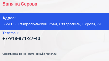 Баня на Серова по адресу 355005, Ставропольский край, Ставрополь, Серова, 61 в дальнейшем Организация, размещена в следующих категориях: