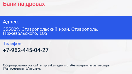Бани на дровах по адресу 355029, Ставропольский край, Ставрополь, Пржевальского, 10а в дальнейшем Организация, размещена в следующих категориях: