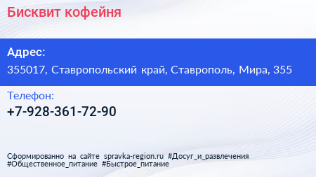 Бисквит, кофейня по адресу 355017, Ставропольский край, Ставрополь, Мира, 355 в дальнейшем Организация, размещена в следующих категориях: