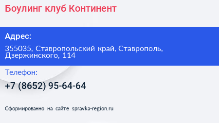Боулинг-клуб Континент по адресу 355035, Ставропольский край, Ставрополь, Дзержинского, 114 в дальнейшем Организация, размещена в следующих категориях: