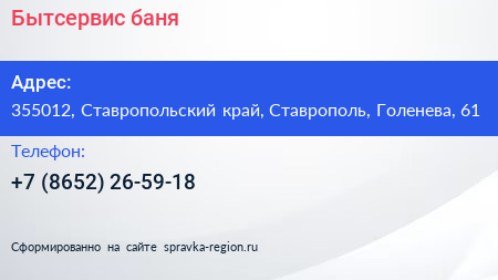 Бытсервис, баня по адресу 355012, Ставропольский край, Ставрополь, Голенева, 61 в дальнейшем Организация, размещена в следующих категориях: