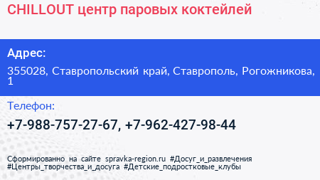 CHILLOUT, центр паровых коктейлей по адресу 355028, Ставропольский край, Ставрополь, Рогожникова, 1 в дальнейшем Организация, размещена в следующих категориях: