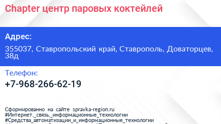 Chapter, центр паровых коктейлей по адресу 355037, Ставропольский край, Ставрополь, Доваторцев, 38д в дальнейшем Организация, размещена в следующих категориях: