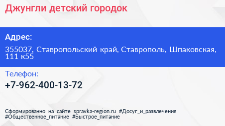 Джунгли, детский городок по адресу 355037, Ставропольский край, Ставрополь, Шпаковская, 111 к55 в дальнейшем Организация, размещена в следующих категориях: