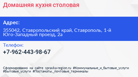 Домашняя кухня, столовая по адресу 355042, Ставропольский край, Ставрополь, 1-й Юго-Западный проезд, 2а в дальнейшем Организация, размещена в следующих категориях: