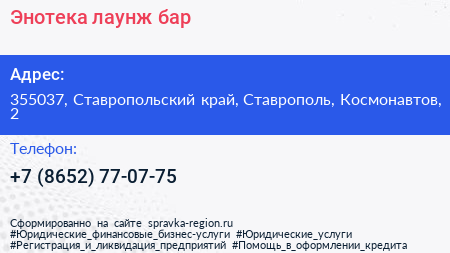 Энотека, лаунж-бар по адресу 355037, Ставропольский край, Ставрополь, Космонавтов, 2 в дальнейшем Организация, размещена в следующих категориях: