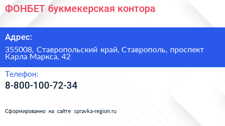 ФОНБЕТ, букмекерская контора по адресу 355008, Ставропольский край, Ставрополь, проспект Карла Маркса, 42 в дальнейшем Организация, размещена в следующих категориях: