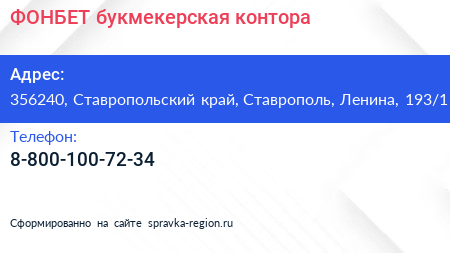 ФОНБЕТ, букмекерская контора по адресу 356240, Ставропольский край, Ставрополь, Ленина, 193/1 в дальнейшем Организация, размещена в следующих категориях: