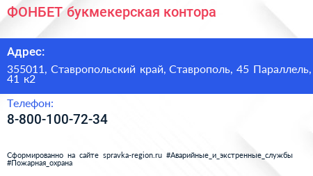ФОНБЕТ, букмекерская контора по адресу 355011, Ставропольский край, Ставрополь, 45 Параллель, 41 к2 в дальнейшем Организация, размещена в следующих категориях:
