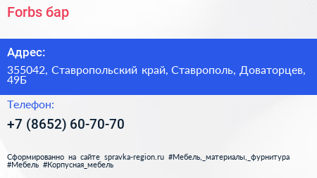 Forbs, бар по адресу 355042, Ставропольский край, Ставрополь, Доваторцев, 49Б в дальнейшем Организация, размещена в следующих категориях: