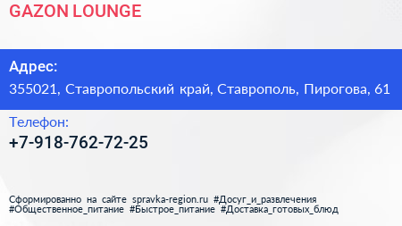 GAZON LOUNGE по адресу 355021, Ставропольский край, Ставрополь, Пирогова, 61 в дальнейшем Организация, размещена в следующих категориях: