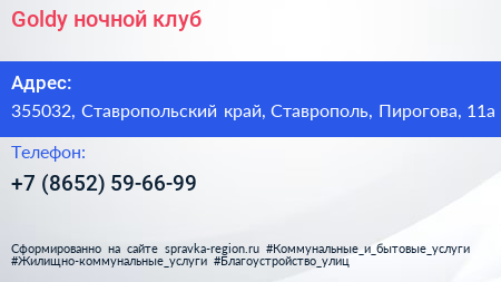 Goldy, ночной клуб по адресу 355032, Ставропольский край, Ставрополь, Пирогова, 11а в дальнейшем Организация, размещена в следующих категориях: