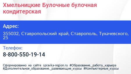 Хмельницкие Булочные, булочная-кондитерская по адресу 355032, Ставропольский край, Ставрополь, Тухачевского, 25 в дальнейшем Организация, размещена в следующих категориях: