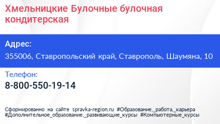 Хмельницкие Булочные, булочная-кондитерская по адресу 355006, Ставропольский край, Ставрополь, Шаумяна, 10 в дальнейшем Организация, размещена в следующих категориях: