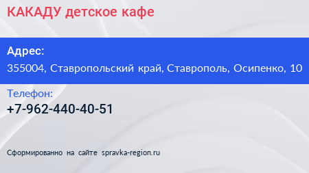 КАКАДУ, детское кафе по адресу 355004, Ставропольский край, Ставрополь, Осипенко, 10 в дальнейшем Организация, размещена в следующих категориях: