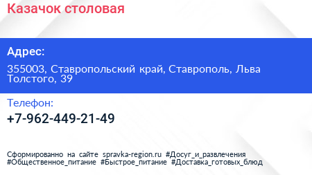 Казачок, столовая по адресу 355003, Ставропольский край, Ставрополь, Льва Толстого, 39 в дальнейшем Организация, размещена в следующих категориях: