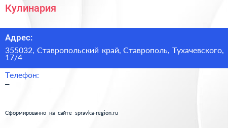 Кулинария по адресу 355032, Ставропольский край, Ставрополь, Тухачевского, 17/4 в дальнейшем Организация, размещена в следующих категориях: