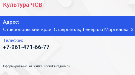 Культура ЧСВ по адресу Ставропольский край, Ставрополь, Генерала Маргелова, 3 в дальнейшем Организация, размещена в следующих категориях: