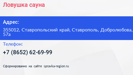 Ловушка, сауна по адресу 355012, Ставропольский край, Ставрополь, Добролюбова, 57а в дальнейшем Организация, размещена в следующих категориях: