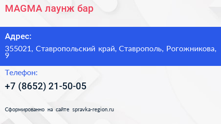 MAGMA, лаунж-бар по адресу 355021, Ставропольский край, Ставрополь, Рогожникова, 9 в дальнейшем Организация, размещена в следующих категориях: