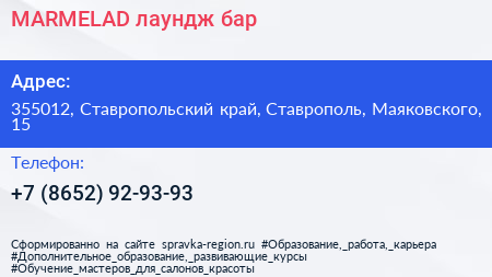 MARMELAD, лаундж-бар по адресу 355012, Ставропольский край, Ставрополь, Маяковского, 15 в дальнейшем Организация, размещена в следующих категориях: